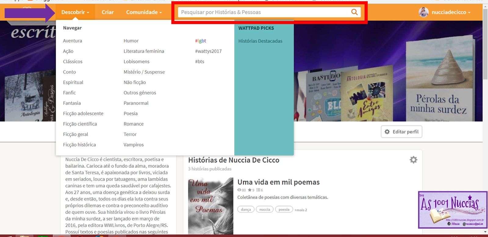 Lá no cantinho superior direito, aparece sua foto e seu login. Clicando nele, surge a tabelinha com diferentes links pra você. O primeiro é do seu perfil (seta amarela) e você pode organizá-lo do jeito que achar melhor: foto de perfil, foto de capa, nome, idade, links de outras redes, biografia/sobre (seta roxa). Se você escrever, aparecem suas histórias ali também.